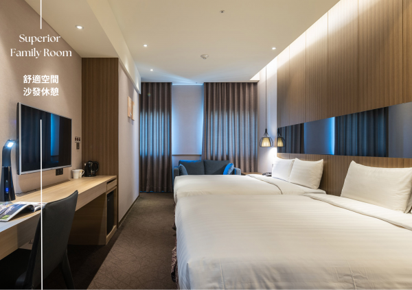 舒適寬敞的空間,室內面積10坪,客房空間規劃專屬寫字桌、沙發、乾濕分離浴室、舒適衛浴設備,養精蓄銳展開美好行程。
