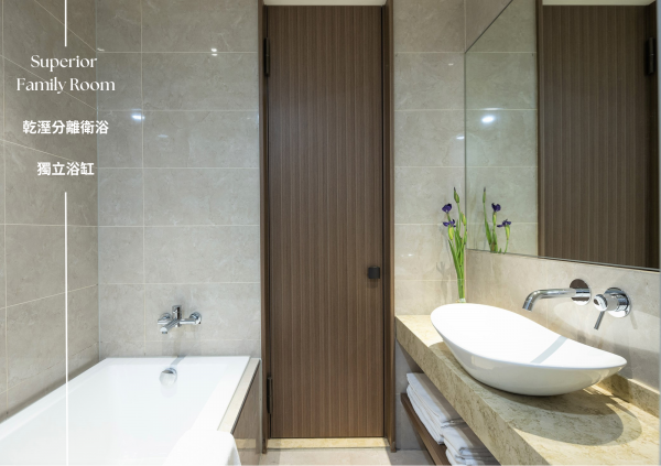 專屬密碼鎖保險箱 / 乾濕分離浴室 / 浴缸 / 免治馬桶 / 閱讀燈 / 迷你冰箱 / 寫字桌及貼心文具用品